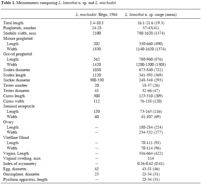Compared to the only other species in the genus, L. lamothei n. sp. differs from L. machadoi by having a greater total length but smaller maximum width, a greater number of segments, a smaller cirrus sac, a smaller scolex diameter, and in the eggs, a larger pyriform apparatus. Other measurements may prove useful in distinguishing the 2 taxa. However, due to the condition of the material from Rêgo (1964), we recommend that new material be collected and measured so a comparison can be made with properly relaxed specimens of L. machadoi. Currently, including this report, species of Lentiella are known only from hystricognath rodents of the genus Proechimys in the Neotropics (Brazil and Bolivia).