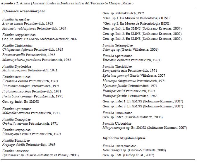 Las investigaciones de arañas fósiles incluidas en ámbar fueron ignoradas por 35 años, por lo que el registro fósil es muy pobre; hasta el momento, se cuenta con 36 especies registradas para México (Perunkevitch, 1963, 1971; GarcíaVillafuerte y Penney, 2003; GarcíaVillafuerte, 2004, 2006, 2007, 2008; SolórzanoKraemer, 2007, Dunlop et. al., 2007). El catálogo mundial de arañas de Platnick (2008) provee un excelente recurso para los taxónomos que trabajan con especies actuales; sin embargo, las especies fósiles no han sido completamente catalogadas.