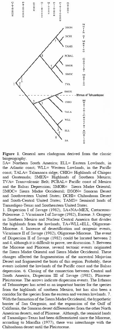 Despite the fact that Savage (1982) has explained the origin of the Mesoamerican herpetofauna in a modern biogeographic framework, his statements are mostly predictions about area relationships based on distributions and geology (see Crother et al., 1992). More rigorous cladistic methods are needed in order to examine Savage's (1982) theory and test its validity (Cadle, 1985). Despite advances in the use of cladistic methods in biogeography, knowledge of the origin of the herpetofauna of Mexico is still in an essentially classic (narrative) state, except for the work of FloresVillela and Goyenechea (2001).
