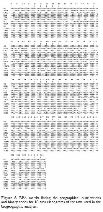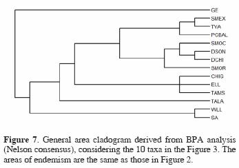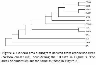 Analysis of the primary BPA data matrix (13 areas x 326 elements, data matrix are shown in Fig. 5), produced 18 equally parsimonious trees (length= 405, CI= 0.805, RI= 0.549, RC= 0.442) (Fig. 6). A Nelson consensus was performed with the resulting GACs of BPA analysis using COMPONENT 2.0 (Page, 1993) (Fig. 7). This GAC has 5 groups; the first include to (PCBAL(SMEX + TVA)), is sister of the second group which includes (SMOR(SMOC(DSON + DCHI))); the third group is a polytomy that contains CHIG, ELL, TAMS, and it is sister to the 2 mentioned above; the fourth group corresponds with TALA and finally, the group that is sister of all includes to (WLL + SA).