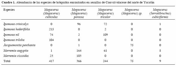 Al analizar estadísticamente la asociación entre coleópteros y especies de convolvuláceas, se observó que las semillas de I. crinicalyx fueron depredadas con mayor frecuencia por M. (M.) porosus (X2= 86.64, 2 g1, p < 0.005), seguido de M. (M.) tricolor (X2 = 32.29, 2 g1, p < 0.005) y un ejemplar de M. (S.) cubiciformis. Las semillas de I. hederifolia fueron infestadas casi exclusivamente por M. (M.) cubiculus (X2 = 209.07, 1 g1, p < 0.005) y sólo 2 individuos de M. (M.) tricolor. Las semillas de I. nil fueron infestadas principalmente por M. (M.) tricolor (X2 = 96.53, 2 g1, p < 0.005), seguido de M. (M.) cubiculus (X2 = 21.58, 2 g1, p < 0.005) y 2 individuos de M. (M.) porosus. Es interesante observar que las semillas de I. triloba sólo fueron infestadas por individuos de M. (M.) cubiculus. También se observó una relación estrecha entre J. penthanta y Megacerus (M.) sp., ya que la mayoría de los coleópteros que emergieron en esta planta pertenecieron a dicha especie y solamente un individuo de M. (M.) porosus (X2 = 72.05, 1 g1, p < 0.005) (Cuadro 1). La mayoría de semillas de M. aegyptia fueron infestadas por M. (M.) porosus (X2= 290.48, 3 gl, p < 0.005), seguida de M. (M.) tricolor (X2 = 190.37, 3 g1, p < 0.005), con menor frecuencia por M. (S.) cubiciformis y por un sólo individuo de M. (M.) cubiculus. Las semillas de M. cissoides fueron infestadas por 2 especies de coleópteros, M. (M.) porosus, con mayor frecuencia, seguida de M. (M.) cubiculus (X2= 50.79, 1 g1, p < 0.005).
