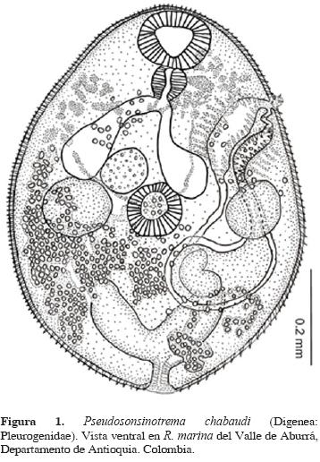 Pseudosonsinotrema chabaudi es registro nuevo para R. marina; con ello se amplía a 114 el número de especies descritas para este hospedero a lo largo de su distribución natural e introducida (véase EspinozaJiménez et al., 2007); asimismo, su hallazgo en Colombia amplía su distribución geográfica en la región neotropical, pues previamente sólo se había colectado en Costa Rica (Caballero y Caballero, 1969).