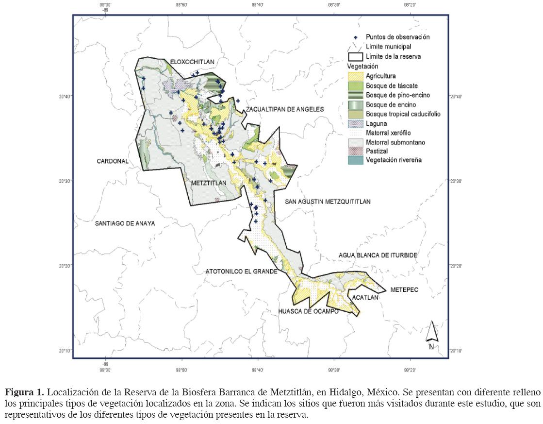 Para la Reserva de la Biosfera Barranca de Metztitlán (RBBM), Hidalgo, esta situación no es diferente, sólo existen recopilaciones parciales o extrapolaciones bibliográficas de las especies de aves presentes, y no se conoce su estacionalidad ni los tipos de vegetación que usa cada una. La RBBM está localizada en la depresión profunda de una llanura que antiguamente se llamó Barranca Grande (Villada, 1865). Esta reserva presenta al menos 6 tipos de vegetación, principalmente xerófitos (CONANP, 2003). Se sabe que los pobladores prehispánicos hacían uso intensivo de algunas especies de aves de la zona (Villada, 1865; Cuevas, 2002) y que existió un conocimiento extenso sobre ellas. No obstante, la información sistemática más antigua para aves con la que se cuenta fue elaborada a mediados del siglo XIX e indica la presencia de 31 especies (Villada, 1865). A finales del siglo XX se publicaron 2 listados nuevos de aves para esta zona; el primero, curiosamente contenido en un artículo de botánica, registra 93 especies, enfocándose en las aves que habitan La Vega, una zona afectada por la actividad humana (Sánchez, 1978); el segundo se enfoca en ambientes más prístinos; registra 163 especies de aves presentes en 3 áreas, de las cuales 2 se encuentran en los alrededores de la zona actualmente ocupada por la RBBM (Mancilla, 1988). A fines del siglo pasado y principios del XXI han aumentado los trabajos en la zona; por ejemplo, Ramírez et al. (1994) publicaron el primer registro de Gavia immer para la laguna de Metztitlán. La Dirección de la RBBM (CONANP, 2003) publicó un reporte técnico que no fue verificado en campo y con algunos registros erróneos, donde se indica la presencia de 215 especies. OrtizPulido et al. (2006) publicaron las fichas técnicas de las 11 especies de colibríes presentes, mientras que MartínezGarcía (2006) registró los colibríes presentes en 4 tipos de vegetación. Finalmente, OrtizPulido y MartínezGarcía (2006) describieron una hembra anidante de Calothorax lucifer con plumaje de macho hallada en el área, especie previamente reportada poéticamente en la zona (HernándezAvilés et al., 2003). A pesar del incremento reciente en las publicaciones dedicadas a la avifauna de la zona, no hay un listado de aves actualizado para la reserva.