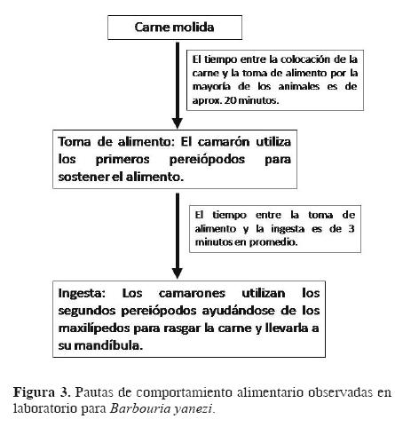 Pautas registradas del comportamiento alimentario. Luego de incorporar alimento (carne molida) al sistema, los animales observados tardaron en promedio 20 min en tomarlo, para lo cual utilizaron los primeros pereiópodos sólo para sostenerlo: una vez hecho esto, dieron pequeñas probadas a la carne con ayuda de los maxilípedos en un promedio de tiempo de 3 min, para posteriormente dedicarse a la ingesta utilizando los segundos pereiópodos y los maxilípedos para rasgar la carne y llevársela a la mandíbula (Fig. 3).