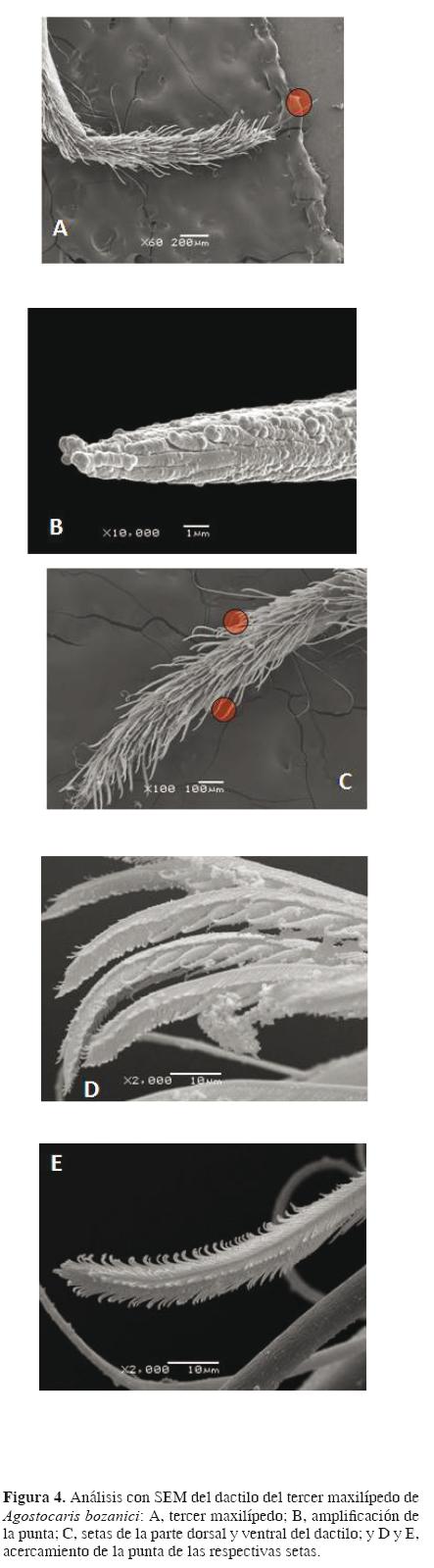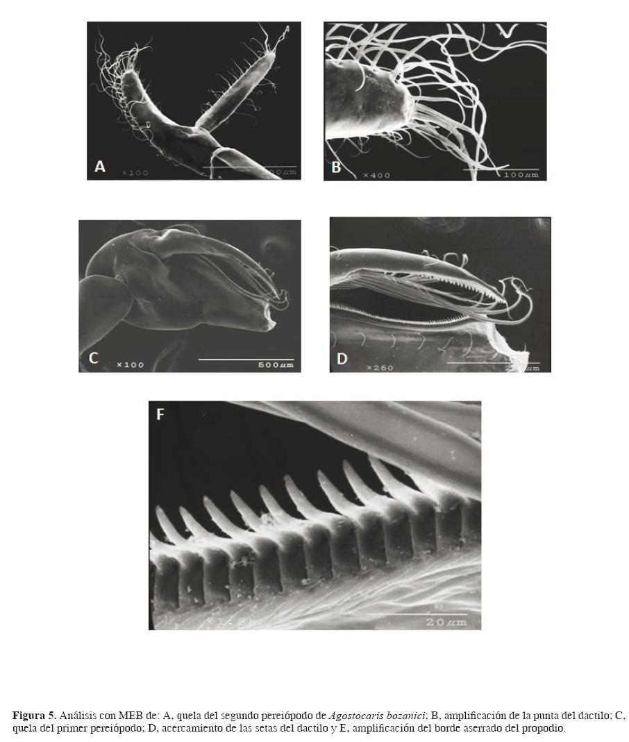 Agostocaris bozanici. El tercer maxilípedo tiene todo el dactilo cubierto de setas (Fig. 4A), pero en la parte apical cuenta con una espina que en su acercamiento se puede observar que está compuesta por cutículas (Fig. 4B), en cambio las setas de la parte más al centro del dactilo (Fig. 4C) tienen una terminación plumosa (Fig. 4D) o aserrada (Fig. 4E). Una de las características distintivas es el tipo de articulación del propodio con el carpo y del dactilo con el propodio, que se puede observar en la quela del primer pereiópodo (Fig. 5C). En primera instancia, es notable la presencia de numerosos dentículos, estrechamente distribuidos, en el margen cortante tanto del propodio como del dactilo (Fig. 5D). Bastante desarrolladas son las largas setas al parecer simples pero muy robustas presentes en la porción dorsal del dactilo y que se ubican en posición posterior al eje de articulación del dactilo con el propodio (Fig. 5D). Por último, se observa una hilera de setas simples regularmente espaciadas en el margen interno del propodio cuya articulación es infracuticular (Fig. 5F). La quela del segundo pereiópodo de A. bozanici se encuentra densamente poblada de setas simples, tanto en la superficie del propodio como del dactilo (Fig. 5A). En estos 2 artejos, las setas se encuentran ubicadas principalmente en la porción apical de los márgenes, externo en el propodio y cortante en el dactilo (Fig. 5B).