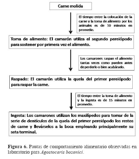Pautas registradas. del comportamiento alimentario. Al incorporar alimento (carne molida) al sistema, los animales observados tardaron en promedio 10 min en tomarlo, para lo cual utilizaron el segundo par de pereiópodos sólo para sostenerlo por primera ocasión. Una vez hecho esto, con ayuda del primer pereiópodo raspan el alimento tantas veces como pueden. Este proceso les lleva 10 min en promedio entre la toma del alimento y la ingesta definitiva, que la realizan utilizando los maxilípedos tomando del primer pereiópodo los restos de carne para llevárselos a la mandíbula con ayuda de la seta terminal del maxilípedo (Fig. 6).