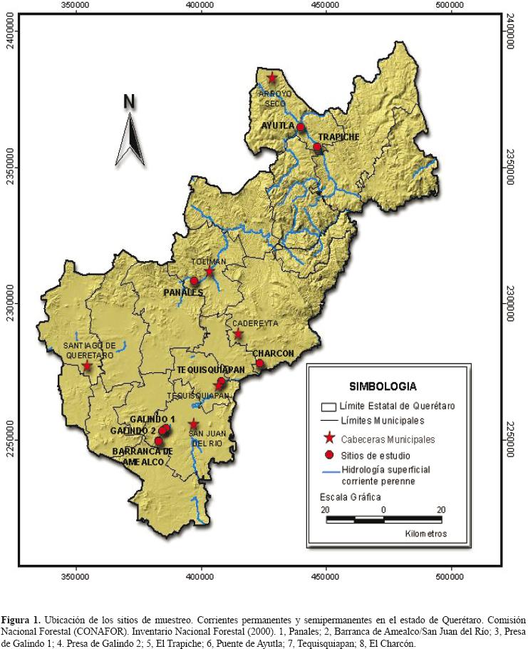 Diseño experimental. Se seleccionaron 8 sitios en 5 municipios del estado de Querétaro que presentaban sabinos y condiciones contrastantes de perturbación y cauces de agua permanentes o semipermanentes (Fig.1). Los sitios de muestreo se agruparon de acuerdo a 3condiciones contrastantes de perturbación: 1) bien conservado, 2) ligeramente perturbado y 3) muy perturbado (Cuadro 1). Esta clasificación se obtuvo a partir de datos obtenidos de la Comisión Nacional del Agua (2001), sobre el Índice de Calidad de Agua de acuerdo con su uso, criterios de perturbación (Olvera et al. 1996), de datos geológicos del Instituto Nacional de Geografía e Informática (INEGI, 2001b; 2001c; 2002a; 2002b; 2003a; 2003b) y de observaciones a las actividades agrícolas y frecuencia de paseantes hechas en campo.