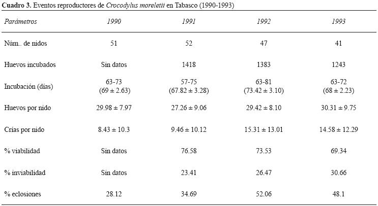 La incubación coincidió en todos los casos con los meses más cálidos del año. El promedio mínimo y máximo de temperatura ambiente para 1990 fue 23.5 y 36.3°C; para 1991, 23.0 y 36.5°C; para 1992, 22.5 y 33.8 °C, y para 1993, 23.5 y 33.4°C. El periodo de incubación fluctuó entre 63 y 76 días para 1990, con un promedio de 69 ± 2.63; entre 57 y 75 para 1991, con un promedio de 67.82 ± 3.28; entre 63 y 81 para 1992, con un promedio de 73.42 ± 3.10, y entre 63 y 72 en 1993, con un promedio de 68 ± 2.23. El promedio de incubación para las 4 temporadas de estudio fue de 69.56 ± 2.81 días. Del total de huevos incubados en los 4 años de estudio, el promedio de la viabilidad fue del 73.15 %, en tanto que el porcentaje de eclosión promedio representó el 40.74 % (Cuadro 3).