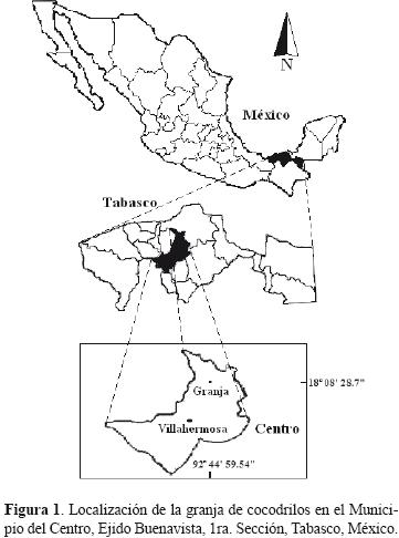 Descripción del área de estudio. La granja de cocodrilos donde se desarrolló el estudio cuenta con una extensión de 7 000m2 aproximadamente; se encuentra ubicada en la ranchería Buenavista, primera sección, municipio del Centro, a 34 km al noreste de la ciudad de Villahermosa, Tabasco (18° 08' 28.7" N y 92° 44' 59.54" O; Fig. 1).