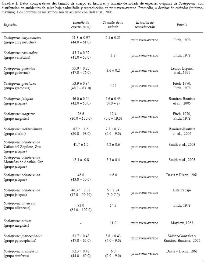 El tamaño de la nidada en la población de Morelos (5 ± 1.24) es diferente del tamaño observado en las poblaciones del cañón del Zopilote (4.2 ± 0.6) y montañas de Acatlán, Guerrero (8.3 ± 0.4) (Smith et al., 2003), lo que indica variación geográfica, como ha sido observado en varias especies de reptiles (Fitch, 1985). Sin embargo, además del factor geográfico, y a diferencia de lo observado en las poblaciones de Guerrero, el tamaño de la nidada de nuestra población tuvo efecto en el tamaño de cuerpo. Si bien es cierto que el tamaño de cuerpo y tamaño de la nidada o camada están asociados en varias especies de lagartijas (S. formosus-Guillette y Sulivan, 1985; Calotes versicolor- Shanbhag et al., 2000; Cnemidophorus (ahora Aspidoscelis) communis-Ramírez-Bautista y Pardo de la Rosa, 2002; S. aeneus y S. bicanthalis-Rodríguez-Romero et al., 2002), no está claro aún, por qué este tipo de relación no ocurre en otras especies (S. gadovae-Lemos-Espinal, et al., 1999; S. spinosus y S. horridus-Valdez-Gonzales y Ramírez-Bautista, 2002; Urosaurus b. bicarinatus- Ramírez-Bautista et al., 1995).