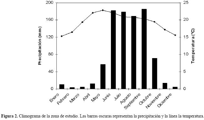 El área de estudio se ubica en el cerro Calera Chica (18º 51' 21.90" N, 99º 11' 97" O, a 1 230 m snm) al sur del poblado de Jiutepec, en el centro de Morelos, México (Fig. 1); es un relicto de selva baja caducifolia (López y Barrera, 1976) con algunos elementos remanentes de Ipomoea intrapilosa (cazahuate), Acacia cymbispina (huisache) y Guazuma ulmifolia. El clima es del tipo cálido subhúmedo Awo" (i)g con lluvias en verano y porcentaje de lluvia invernal menor del 5 %. La precipitación media anual varía entre 800 y 1 000 mm, la temperatura media anual es de 24.3º C, y el cociente precipitación/temperatura es 33.5. La mayor precipitación ocurre en septiembre con 195 mm (190-200) y la mínima entre diciembre y marzo con menos de 5 mm (Fig. 2). Las temperaturas más altas (27.8° C) se presentan en mayo y las más bajas (20.5º C) entre diciembre y enero (García, 1964).