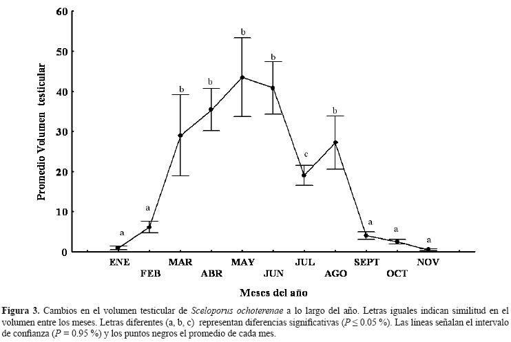 El ciclo de reproducción de los machos se muestra en la figura 3. El primer incremento significativo (Tukey = 0.000219) del volumen testicular en el año, ocurre en marzo (x = 29.02 ± 6.37), y alcanza los picos más altos en mayo (x = 43.50 ± 9.32) y junio (x = 40.84 ± 13.54). En el mes de julio, el ciclo muestra una disminución no significativa (x = 19.02 ± 3.01); sin embargo, vuelve a incrementarse en el mes de agosto (x = 27.20 ± 6.35), para finalizar en septiembre, y volver a los niveles más bajos en el periodo de octubre a noviembre. El volumen testicular cuando inicia la actividad reproductora, se relaciona en forma positiva y significativa con la temperatura (r = 0.897, F = 114.81, P = 0.00000, R2 = 0.8485, n = 44), pero no con la precipitación (r = 0.040, P = 0.000037, n = 44).