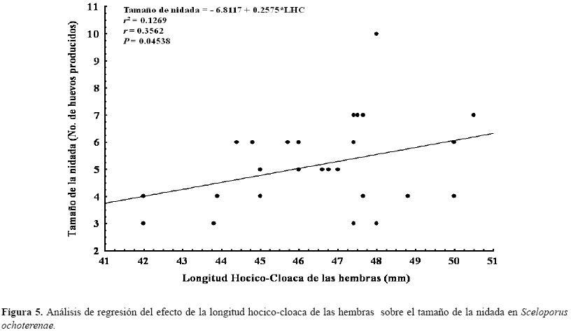 Las primeras crías fueron observadas en septiembre y presentaron una LHC promedio de 23.12 mm (17.0 27.0 ± 3.27, n = 22). El tamaño de la nidada fue de 5 huevos, estimado a partir de huevos en los oviductos (3-7 ± 1.24, n = 10 hembras) y no hubo diferencias significativas (F = 0.098, P = 0.75589) con el tamaño de la nidada, estimado a partir de folículos ováricos (x = 5, 3-10 ± 1.96, n = 22 hembras). En consecuencia, la suma de los datos de huevos en los oviductos y folículos ováricos fue considerada para el análisis de regresión. Este análisis mostró un valor relativamente bajo, con efecto significativo de la LHC sobre el tamaño de la nidada (r = 0.356, F = 4.35, P = 0.04538, n = 32) (Fig. 5). Sin embargo, el peso de las hembras no tuvo efecto (r = 0.2000, F = 1.25, P = 0.27162, n = 32).