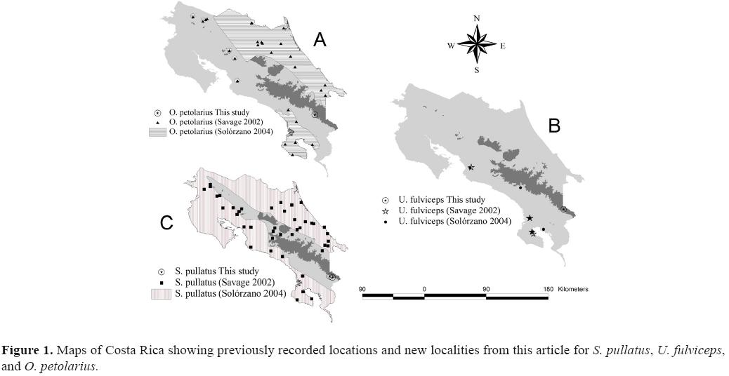 During extensive conservation planning field work in the Talamanca mountain range from 2006 to 2010, O. petolarius and U. fulviceps were each seen once, while individuals of S. pullatus were seen twice on the Pacific slope. An adult male O. petolarius was captured in 2006 in Altamira, Buenos Aires, Puntarenas at 9° 1' 45.71" N and 83° 0' 29.82" W at 1 334 m a.s.l. (Figs. 1, 2c). An adult female of U. fulviceps was captured in 2008 at Finca Las Alturas del Bosque Verde, Sector La Escuadra, near Las Alturas, Coto Brus, Puntarenas at 9° 0' 13.43" N and 82° 56' 6.19" W at 1 578 m a.s.l. (Figs. 1, 2b). Lastly, 2 male adults of S. pullatus were captured at Finca Las Alturas del Bosque Verde, Las Alturas, Coto Brus, Puntarenas; the first specimen was captured in 2008 at 8° 56' 28.86" N and 82° 50' 17.42" W at 1 372 m a.s.l., and another was captured in 2010 at 8° 56' 8.96" N and 82° 49' 28.36" W at 1 370 m a.s.l. (Figs. 1, 2a).