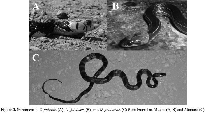 All 3 species are relatively easy to identify in the field because they have prominent identifying characteristics. S. pullatus is a large snake (total maximum length of 260 cm) with a typical color that is unique to the species; in Costa Rica, it can only be confused with larger species (i.e. Chironius grandisquamis, Clelia clelia, Drymarchon melanurus, Lampropeltis triangulum, and Pseustes poecilonotus; Solorzano, 2004), but its distinctive coloration makes for easy field identification. O. petolarius is a mediumsized snake (total maximum length of 120 cm) with similar coloration to false coral snakes (i.e. Erythrolampus bizona, E. mimus, Liophis ephinephalus, Rhinobothryum bovallii, Scaphiodontophis annulatus, Siphlophis compressus, Tantilla supracincta, and Urotheca euryzona; Solorzano, 2004); however, its distinct color pattern, size, and scale configuration make it difficult to confuse with similar species. Lastly, U. fulviceps is a small snake (maximum total length 65 cm) only confused with other species in the same genus; however, it has a distinctively striped dorsum and head cap extended from 3 to 4 scales onto the neck and presents temporal 1+2 (Solórzano, 2004).