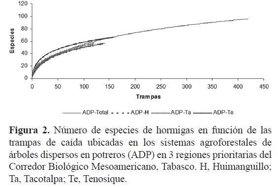 Acumulación de especies. Los resultados de la evaluación de la relación entre el esfuerzo de muestreo (número de trampas de caída) y la cantidad de especies registradas, demuestran que para los sistemas agroforestales se obtuvieron valores desde el 75% en el caso de aquellos de ADP (Huimanguillo 83%, Tacotalpa y Tenosique 75%; Fig. 2). Por otro lado, en el caso de AL (Fig. 3), se observó que la eficiencia de muestreo fue menor para 2 regiones (Huimanguillo 66% y Tenosique 69%), lo que significa que aún faltaba una proporción importante de la mirmecofauna por registrar. No obstante, el esfuerzo de muestreo resultó altamente efectivo para Tacotalpa, donde se obtuvo el 96% de las especies de hormigas esperadas según el índice Chao1.