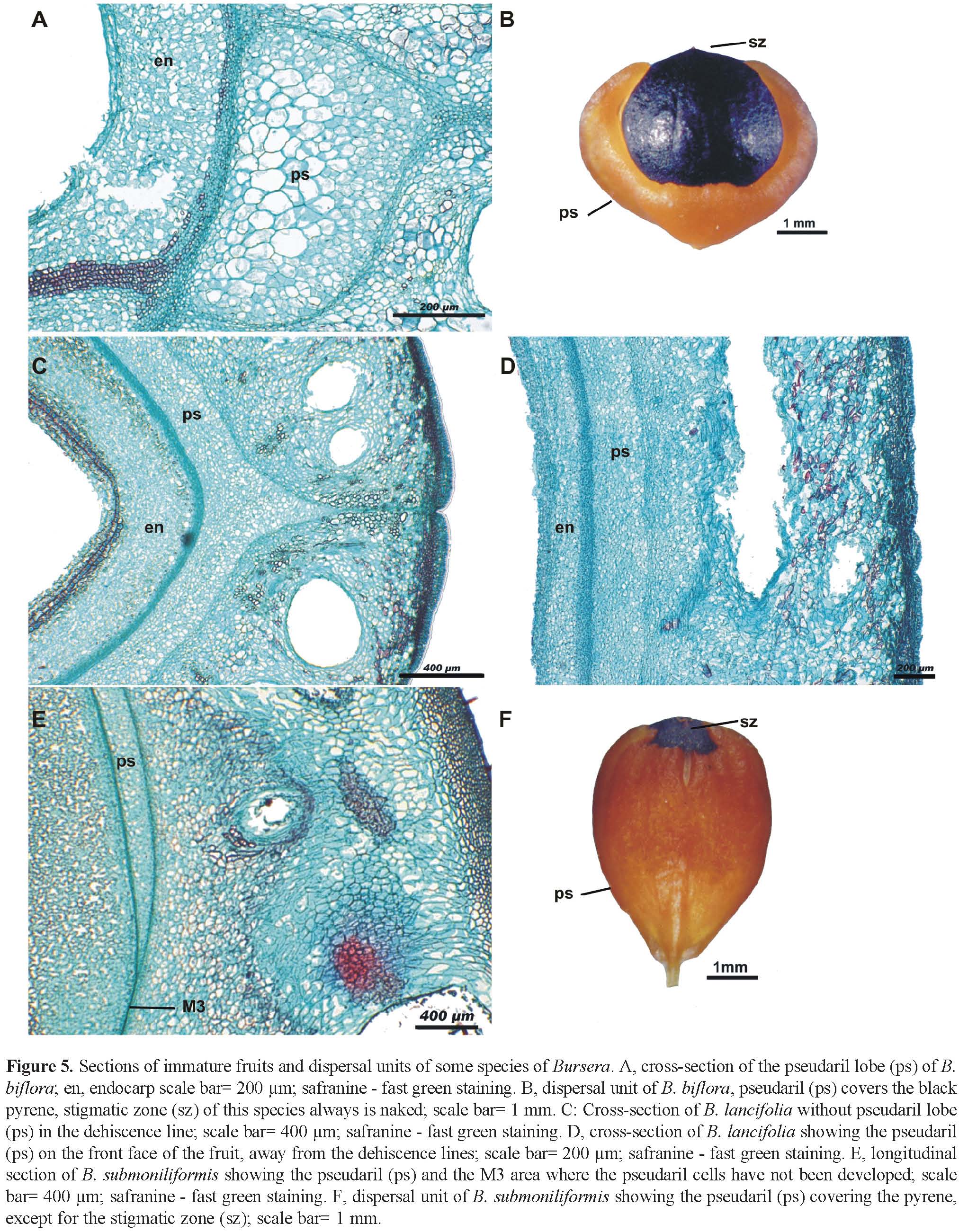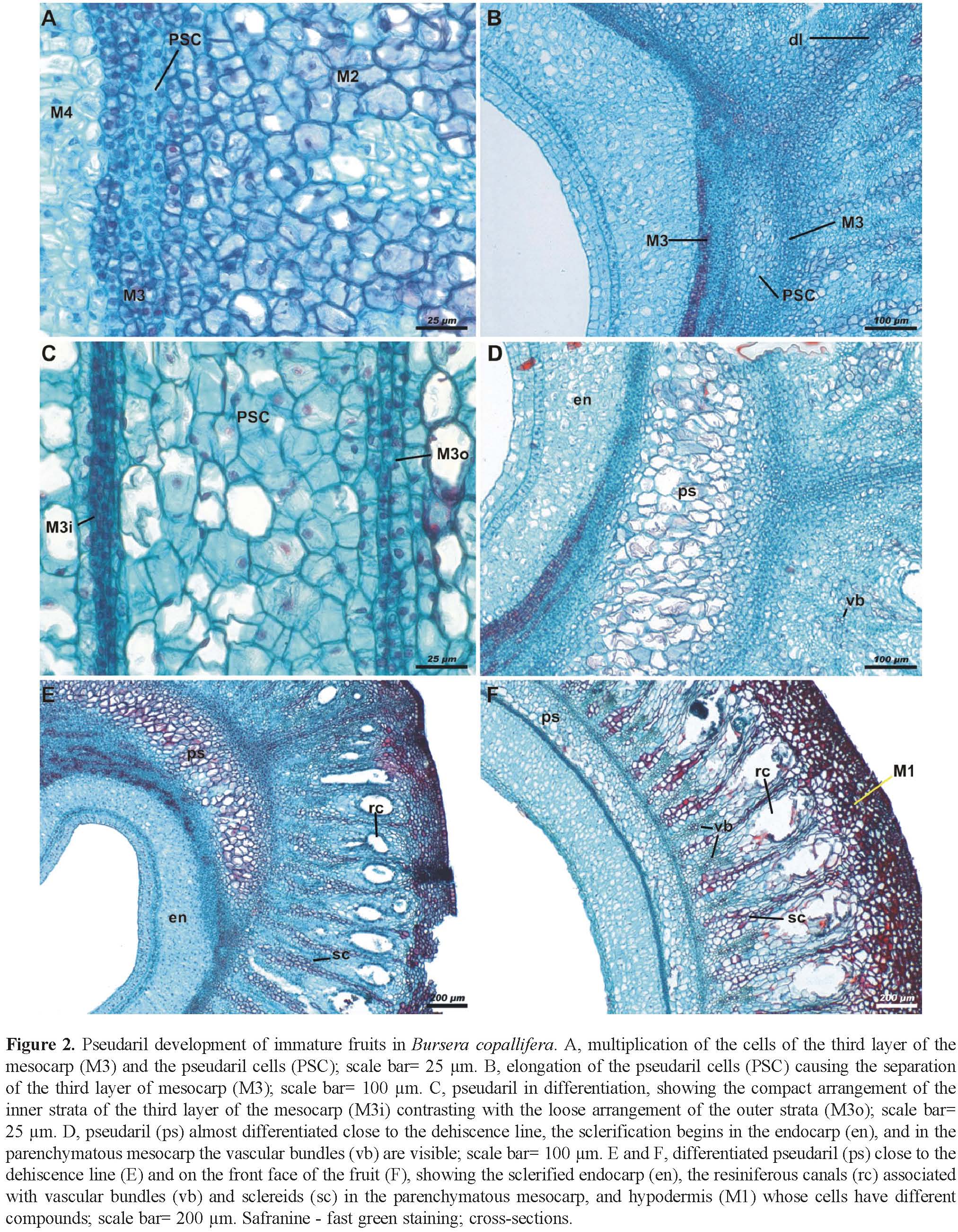 The early developmental anatomy of the Bursera fruit studied here shares many ontogenic similarities with that of Commiphora as described by Van der Walt (1975), who performed the development study of pseudaril based on information of almost 40% of the Commiphora species. It is important to note that this latter work studied only young fruits. In contrast, the present study also used floral buds and flowers in different stages of development in order to describe the pseudaril ontogeny. According to van der Walt, the pseudaril of Commiphora develops from the mesocarp, and pseudaril cells differentiate after most of the inner epidermis derivatives (viz., endocarp) differentiated. This is the same development pattern observed in species of Bursera section during the anthesis and post-anthesis stages, when the endocarp is clearly visible and the third layer of the mesocarp (M3) presents the same histological characteristics as the stratum that gave rise to it (M4). As interpreted by van der Walt in Commiphora, the pseudoaril cells are formed by the division and enlargement of hypodermal cells adjacent to the endocarp, corresponding in the present study to the third layer of the mesocarp (M3) of Bursera, wherein cells divide and enlarge giving rise to PSC. The histological description of pseudaril cells is very similar between the 2 genera: they are bigger and more transparent than surrounding cells. When the fruit ripens, these relatively large, thin walled cells contain lipids.