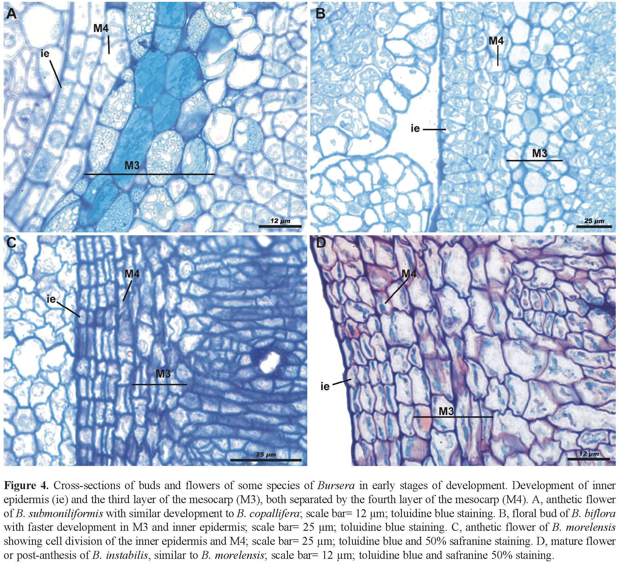 Differences were found in the other species analyzed with regard to the timing in which the layers are developed, but the ontogenic pattern was the same for all species. The development stages of Bursera submoniliformis (section Bullockia, Copallifera group; Fig. 4A) show the most similar patterns to those in B. copallifera. Development is earlier in B. biflora (section Bullockia, Glabrifolia group), when compared to B. copallifera. At the floral bud stage, the internal epidermis has already divided, giving rise to at least 4 strata. M3 also has a major development at this stage: it is pluristratified, with cells of varying size in division, but with less starch (Fig. 4B). In all species of the Bursera section, endocarp differentiation starts during the bud stage; when the ovules reach their final size, the internal epidermis has already divided into 3 more strata. In these species, layers M3 and M4 have the same histological characteristics. The division of M4 is observed, confirming that it gives rise to M3; nevertheless, the starch in the M3 cells begins to be visible in far earlier stages, shortly post-anthesis (Figs. 4C, D).