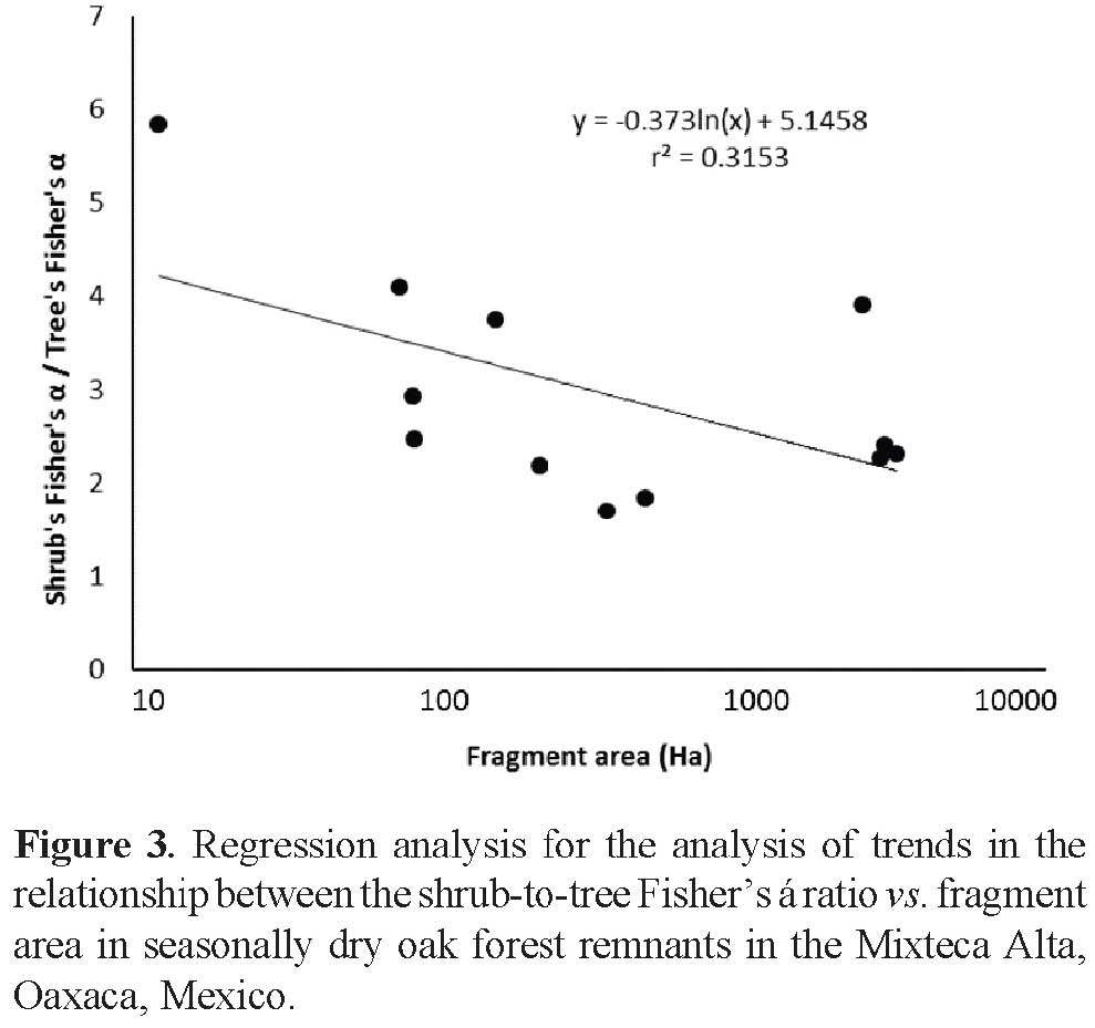 Vegetation sampling was conducted on 216 plots distributed among the 12 selected fragments, using 4 to 50 sampling points per fragment, depending on fragment size. All plots were geo-referenced, using a GPS (GARMIN 60csx) with a 5 m resolution. In order to analyze the diversity and structure of the vegetation, we sampled the individuals of both the tree and the shrub layer. All woody plants ≥ 2.5 cm DBH and ≥ 2.5 m height found in the sampling plots were included in the tree layer; whereas all woody plants < 2.5 cm DBH or < 2.5 m height were included in the shrub layer. Sampling plots of 102.06 m2 and 12.56 m2 were used for the tree and the shrub layer, respectively. Specimens of all species found in the sampling plots were deposited at the Herbarium OAX. The tree and shrub diversity per fragment was assessed using Fisher's αbecause it is relatively insensitive to sample size (Fisher et al., 1943; Magurran, 2004).