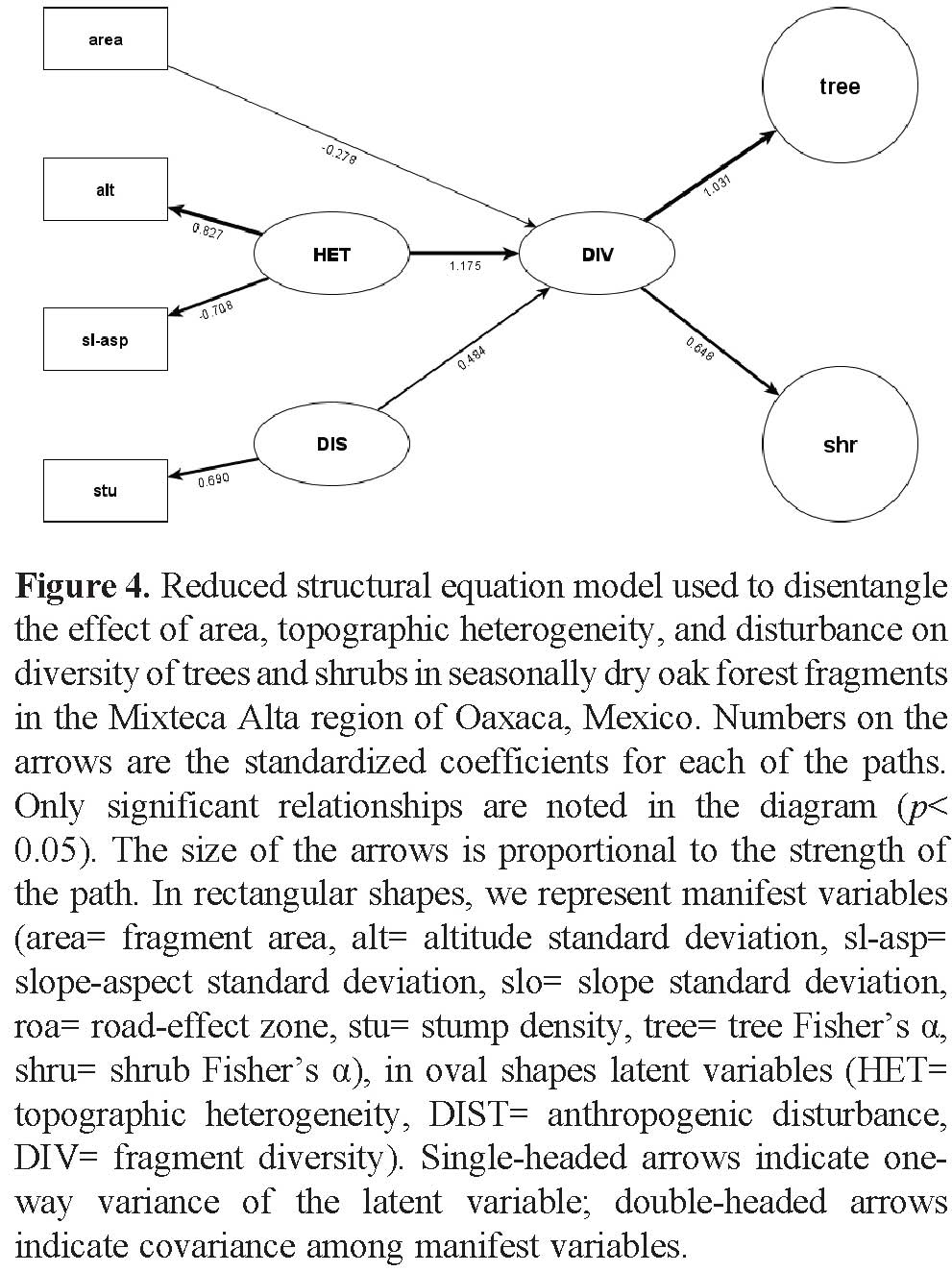 Structural equation modeling revealed the effect of anthropogenic disturbance, fragment area, and topographic heterogeneity in woody plant species diversity in remnants of seasonally dry oak forests in the Mixteca Alta, southern Mexico. In accordance with our hypotheses, woody plant species diversity per fragment can be explained directly by the topographic heterogeneity, the intensity of anthropogenic disturbance, and the fragment area, as has been shown in other studies (Ross et al., 2002; Cayuela et al., 2006a; Echeverría et al., 2007). Our results indicate that, when topographic heterogeneity and human disturbance are taken into account, the effect of fragment size on diversity is negative in the seasonally dry oak forest of the Mixteca region. More specifically, smaller fragments with similar altitude and slope-aspect and human disturbance level tend to be more diverse than large fragments.
