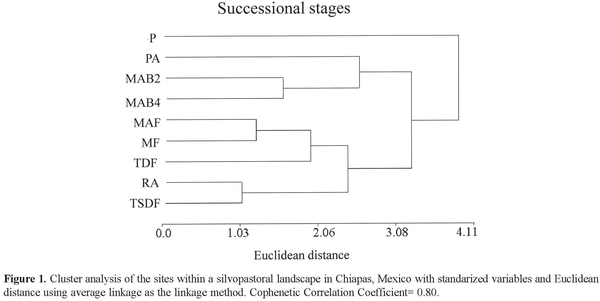 Site selection. The landscape elements were plotted on a 1:75 000 spatial orthophoto (Inegi, 2001), and digitized into a Geographical Information System (Arc View version 3.2 ©). To characterize the number of trees and shrubs, we randomly established 3 plots of 10 × 10 m at each site. Shrubby tree cover or high (> 2 m) was measured with a spherical densitometer. At each site, a fixed transect of 120 m was established in which we measured tree cover in cardinal point directions (i.e. N, S, E, W). We then selected 9 sites, an average distance of 4 km apart (minimum distance 610 m), within a silvopastoral landscape. The sites were selected to represent different successional stages and management and were classified to 3 successional stages with a cluster analysis, using average linkage as the joining method and Euclidian distance as the distance measure (Fig. 1): i) early (S1), which includes a pasture with no trees or shrubs. ii) Intermediate (S2), including 2 areas of young managed Acacia shrubs (2 and 4 years old, respectively) and a pasture with Acacia pennatula, and iii) late (S3), with a tropical subdeciduous forest, a tropical deciduous forest, a mature tropical deciduous forest fallow, a ravine with tropical dry forest and a mature Acacia forest (Table 1).