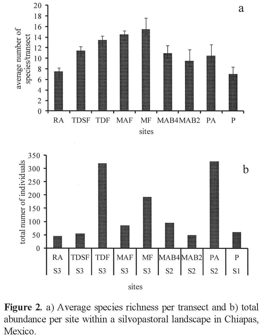 We recorded 1 230 individuals, representing 33 species across the entire landscape (Table 2). In general, the total number of species decreased from the late successional to early successional habitats: there were 28 species in the late successional stages, 18 in the intermediate successional stages and 8 in the early successional stages. Similarly, the average number of species/transects was higher in S3 (with the exception of the ravine) than in the other successional stages (Fig. 2a). The highest abundances were obtained in TDF and in the pasture with Acacia (Fig. 2b). The average number of individuals per site was higher in S2 than in the other successional stages.