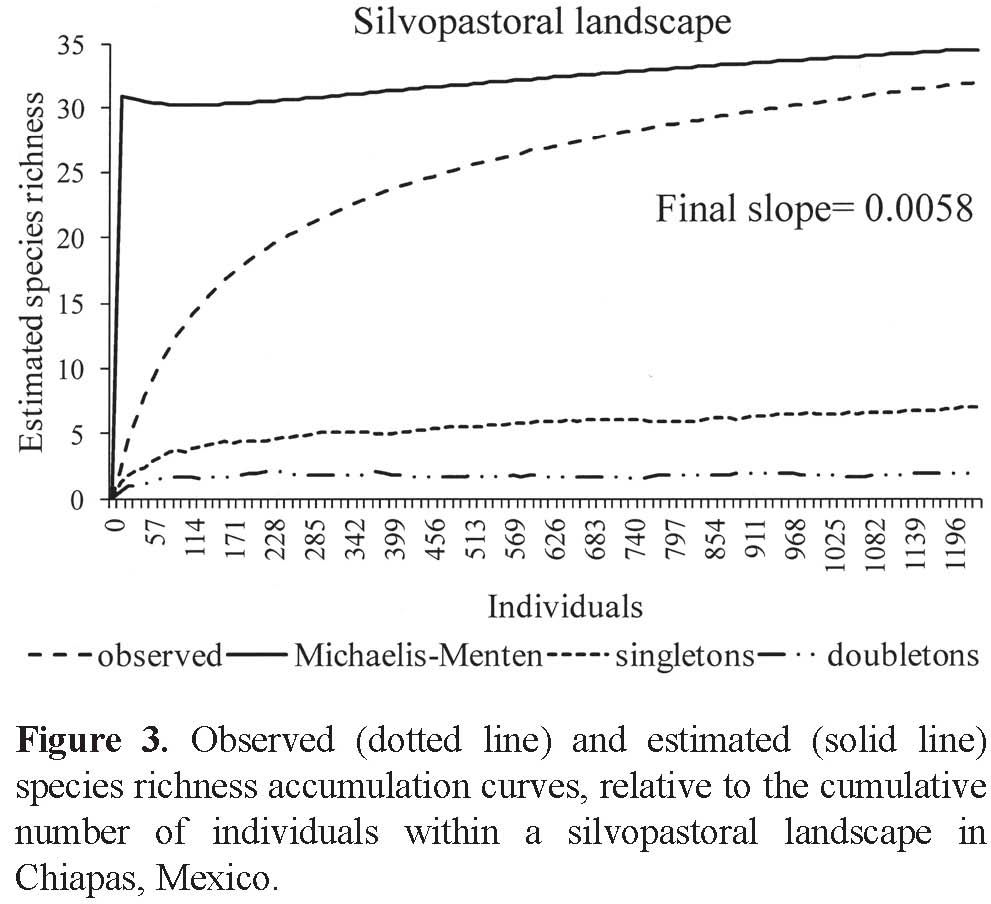 The Michaelis-Menten (MM) equation was used as a reliable estimator for dung beetles, since MM commonly used in diversity inventory assessment and is an adequate function for a relatively small-intermediate number of samples (Colwell and Coddington, 1994; Colwell, 2009). For this equation, and using number of individuals as a unit of sampling effort, the survey can be considered sufficiently reliable despite being incomplete, even when the slope becomes approximately < 0.1. Using individuals, one could establish the slope cut-off at 0.05 or 0.01, which would imply a new species every 20 or 100 individuals, respectively. However, if the final slope is much higher than the 0.1 cut-off point, it may be that we are using such a low number of (i) sampling places, (ii) sampling methodologies, or (iii) sampling dates, that we are unable to capture reliable inventories.