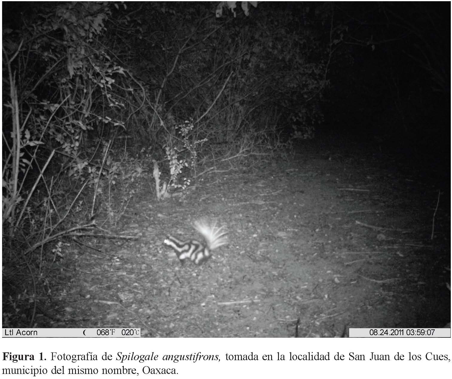Aun cuando Dávila et al. (2002) hacen referencia a la presencia del género Spilogale sp. en la cañada oaxaqueña con base en el trabajo de Flannery (1967) y por otro lado Ramírez-Pulido y Martínez-Vázquez (2007) incluyen a la especie en un listado de mamíferos presentes en la porción poblana de la RBTC (sinonimia: Spilogale putorius), estas fotografías son la primera evidencia documentada de S. angustifrons dentro de la reserva, particularmente en la región de la cañada oaxaqueña.