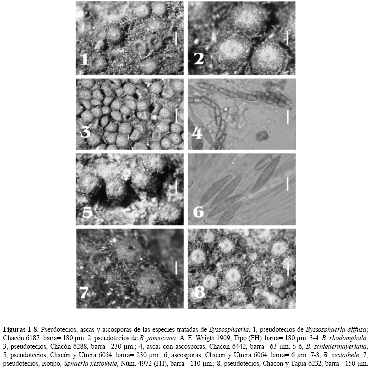 Material examinado. Jamaica: 1909, A. E. Wrigth, (holotipo, FH). México: Veracruz, municipio de Xalapa, área natural protegida, Parque Natura, 1 Noviembre 2011, Chacón y Tapia 6586. Municipio de San Andrés Tlalnehuayocan, San Antonio Hidalgo, 11 Noviembre 1999, Jarvio 379. Venezuela: estado de Aragua, Parque Nacional Henri Pittier, Rancho Grande Biological Station, Toma trail to water source, elev. 1 200-1 300 m, 3 Diciembre 1990. G. J. Samuels, B. Hein and S. M. Huhndorf 7832 (NY). Comentarios taxonómicos: Byssosphaeria jamaicana es una especie afín a B. schiedermayeriana, pero se diferencia principalmente porque esta última presenta el área que rodea al poro de color naranja a rojizo y no grisáceo-pálido o café-pálido. Por otro lado, aunque B. salebrosa (Cooke y Peck) M. E. Barr también presenta el área del poro pálido, pero se distingue porque sus ascosporas son más grandes de (30-) 40-50 x 6-7 (-9) μm y porque el pseudotecio carece de apéndices hifales. El tamaño de ascosporas encontrado en el material tipo es de (25-) 30-36 (-38) x (6-) 7-8 μm, tamaño que concuerda con el de los materiales mexicanos. Byssosphaeria jamaicana se conocía de Jamaica, Puerto Rico y Trinidad y Tobago (Barr, 1984, 1990) y de China (Li y Zhuang, 2008). De México fue citada por Medel (2007b) del estado de Veracruz. En este trabajo se registra de una nueva localidad.