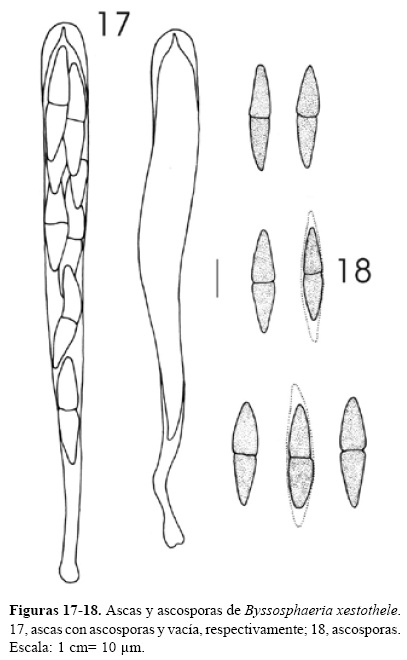 Comentarios taxonómicos. Byssosphaeria xestothele es muy parecida a B. schiedermayeriana, sin embargo, esta última se distingue principalmente porque presenta ascosporas más grandes (27-) (29-) 30-37 (-40) (-42) x (5.5) 6-7 μm, además de que sus ápices no son oscuros. En el material tipo se encontraron ascosporas de (20-) 23-28 (-30) (-32) x (4.5-) 5-6 (-6.5) μm, fusiformes, con ápices obscuros, con 1-3 septos, de color café-pálido, café-oliváceo a café-obscuro, lo cual concuerda con el material mexicano. Se revisó también el material de B. xestothele del herbario NY citado por Barr (1984, 1990) de San Luis Potosí, México, sin embargo, debido al mal estado que presentaba el ejemplar no fue posible observar estructuras microscópicas relevantes y se dio por hecho la legitimidad del registro. En esta contribución se registra por vez primera del estado de Veracruz.