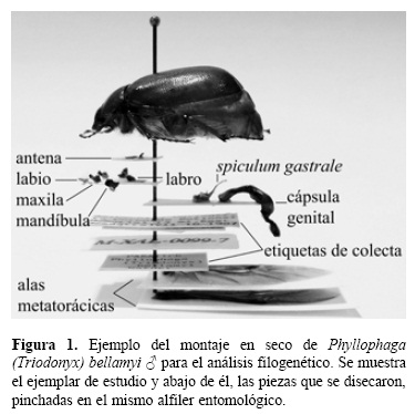 Todas las muestras de las especies contaron con al menos un representante de cada sexo. En algunas especies se revisaron series de hasta 9 individuos para conocer la variación de los caracteres y evitar una valoración inadecuada de los mismos. Los ejemplares seleccionados se reblandecieron en vapor de agua durante 30 minutos o dentro de una cámara húmeda durante un día. Todos los ejemplares se disecaron con ayuda de un microscopio estereoscópico Leica Zoom 2000 para exponer sus piezas bucales; mentón, maxilas, mandíbulas y labro; antenas, con las lamelas separadas; alas y genitales. Las piezas extraídas se pegaron con goma entomológica sobre pequeños soportes de papel opalina blanco y se montaron en el mismo alfiler del ejemplar de origen (Fig. 1). Las placas genitales de todas las hembras no se retiraron del ejemplar y solo se expusieron entre la placa anal y pigidial, de forma que se pudieron analizar observando al ejemplar en vista ventral.