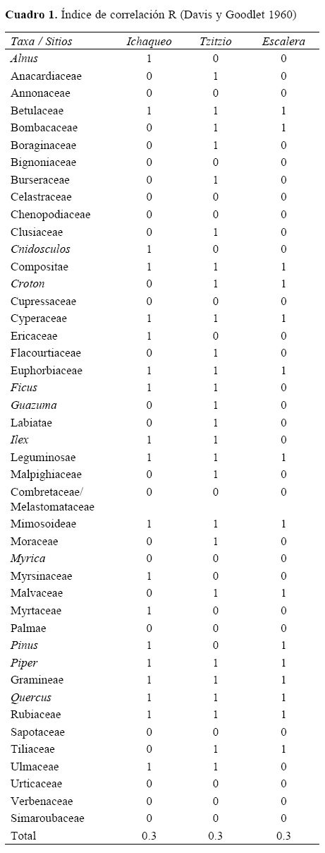 La relación entre la vegetación y la lluvia de polen se analizó a través del índice R expresado como A= BO / (PO+P1+BO); donde Bo= número de taxa presentes en el polen más los taxa encontrados en la muestra de la vegetación; Po= número de taxa encontrados en cada muestra de polen, pero ausentes en la muestra de la vegetación y P1 = número de taxa presentes en la vegetación, pero que no se encuentran en la muestra de polen. El índice R varía entre 0 y 1. A= 1 significa que todos los taxones encontrados en la vegetación están presentes en los taxa encontrados del polen y en el caso de que A= 0 significa que no existe relación entre la vegetación y los taxa encontrados en las muestras de polen (Davis y Goodlett, 1960).