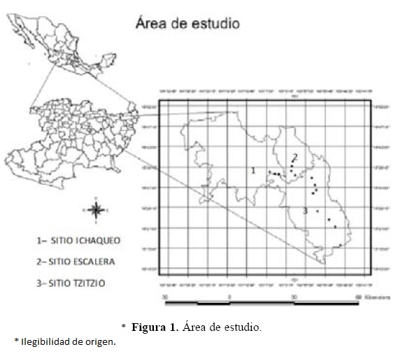 Área de estudio. El área de estudio está localizada en la subprovincia de Mil Cumbres de la cuenca del Balsas medio, dentro de los municipios de Charo, Tzitzio y Tumbisca ubicados en el estado de Michoacán (Fig. 1). El área presenta un clima templado subhúmedo (C(W2)(W), con pequeñas porciones del tipo semicálido subhúmedo (A)C(W2)(W) (Fernández-Nava et al., 1998), con precipitaciones menores a los 1 000 mm al año y la temperatura promedio anual 18-30° C, lo que ocasiona que se desarrollen bosques de pino-encino, bosques de encino-pino y bosques mesófilos en las zonas más húmedas y en las partes bajas: selvas medianas subperennifolias y selvas bajas caducifolias (Miranda y Hernández, 1963; Rzedowski, 1981; Fernández-Nava et al., 1998; Carranza, 2005).
