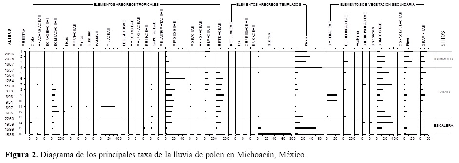Las muestras de Tzitzio fueron dominadas por elementos tropicales como: Sapotaceae, Palmae, Mimosoideae, Ulmaceae y Urticaceae. Boraginaceae y Croton se identificaron sólo en el sitio 5 y Malpighiaceae fue hallado en el sitio 7, el cual era un sitio caracterizado por una vegetación de tipo sabanoide. Anacardiaceae, Rubiaceae y Combretaceae/Melastomataceae fueron encontrados en las muestras provenientes de los sitios con menor altitud. Los sitios 11 y 12 se diferenciaron de los anteriores por la presencia de Guazuma y Tiliaceae, en donde formaban manchones casi monoespecíficos ocasionando una fuerte relación polen-vegetación.
