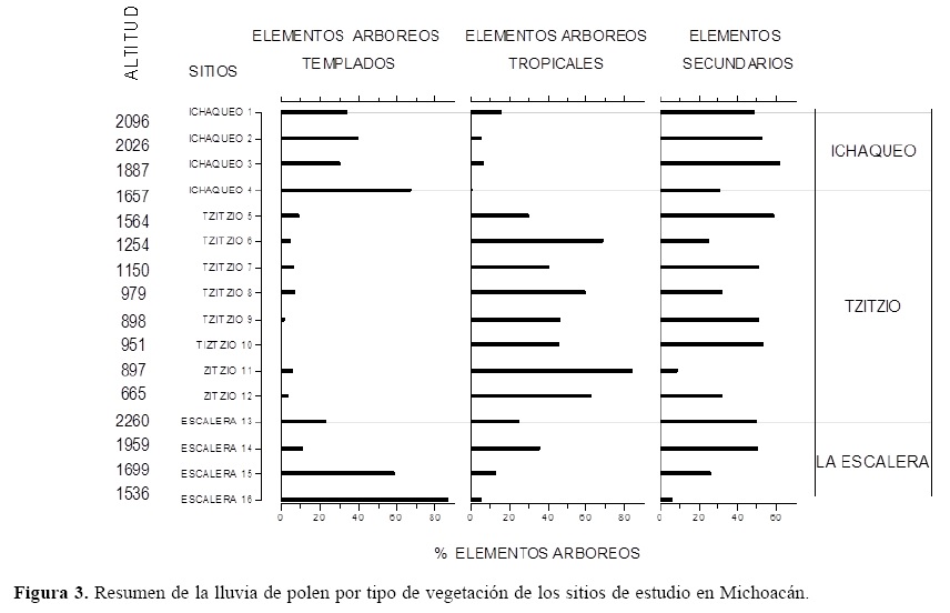 La señal polínica de Ichaqueo (sitios 1-4) indica la presencia de un bosque de pino-encino, lo que explica la alta proporción de polen de Pinus en algunos sitios (60%), siendo el porcentaje más alto encontrado para este taxa en toda el área de estudio. Otros taxa de bosque templado con proporciones significativas en Ichaqueo fueron Quercus, Ilex y Betulaceae. Elementos tropicales como Myrtaceae, Ulmaceae y Mimosoideae comienzan a aparecer conforme descendemos altitudinalmente, esta mezcla de elementos tropicales y templados indican una vegetación de bosque mesófilo (Figs. 2, 3).