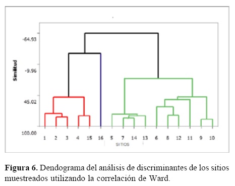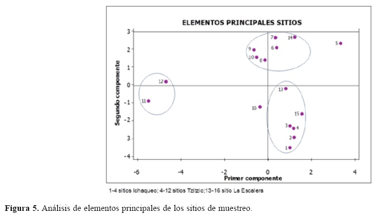 El análisis de componentes principales mostró la influencia del gradiente altitudinal en la zona, por lo que ordenó a los taxa encontrados en 3 grupos. Un grupo de elementos tropicales, en donde se encuentran elementos arbóreos tropicales como Bombacaceae, Ericaceae, Anacardiaceae, Ficus, Acacia, Tiliaceae y Myrtaceae. Un grupo de elementos templados con Pinus, Betulaceae y Quercus, y un tercer grupo caracterizado por elementos secundarios como Croton, Gramineae, Euphorbiaceae y Compositae (Fig. 4). El APC (análisis de componentes principales) (Fig. 5) y el análisis de discriminantes (Fig. 6) aplicado a los sitios de colecta encuentra 2 grandes grupos: uno formado por los lugares ubicados en Tzitzio, en donde la selva baja caducifolia es la vegetación dominante y otro grupo, reúne los sitios que se ubican en Ichaqueo y La Escalera, caracterizados por un bosque templado.