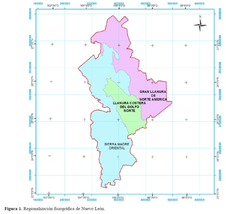 Área de estudio. La región conocida como Gran Llanura de Norteamérica alcanza su límite sur en los estados de Coahuila, Tamaulipas y Nuevo León; en este último estado se extiende a través de su porción noreste, con una cobertura de 23 138.39 km2 y una representación estatal del 36.1% (Inegi, 1986). Espacialmente para Nuevo León la Gran Llanura de Norteamérica con referencia en el Datum WGS84 se ubica entre las coordenadas 27°47'58.776" N, 100°11'18.34" O y 25°01'04.404" N, 99°10'39.036" O, así como 25°26'54.060" N, 98°25'19.199" O y 27°11'42.323" N, 100°50'02.940" O. (Fig. 1).
