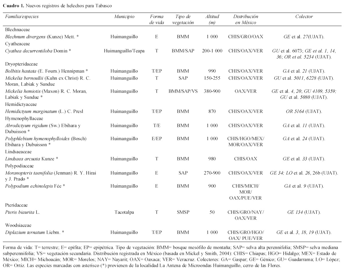 Durante una revisión de helechos en los herbarios del Colegio de Posgraduados, Campus Tabasco (CSAT) y de la Universidad Juárez Autónoma de Tabasco (UJAT) para la preparación de una guía ilustrada de los helechos de Tabasco, México, se identificaron 13 especies como nuevos registros para el estado (Cuadro 1, Figs. 1-3), (2). La determinación de los especímenes se realizó con base en los trabajos de Davidse et al. (1995) y Mickel y Smith (2004). En el Cuadro 1 se indica la información de la etiqueta de cada ejemplar revisado; cuando los tipos de vegetación no fueron descritos en la etiqueta se dedujeron de la revisión de los mapas de vegetación del Inegi (2011). Diez de los nuevos registros aquí presentados fueron recolectados en el municipio de Huimanguillo, 1 en Huimanguillo y Teapa y otro en Tacotalpa (Cuadro 1, Fig. 1).