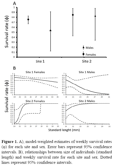 In addition, our estimated survival rates, particularly those for females in site 1 and for both sexes in site 2 (Fig. 1A) are relatively high (> 0.7) and similar to those observed in the Purificación and Chandiablo rivers (Zúñiga-Vega et al., 2012a). However, we recognize that the precision of our estimates is low (excepting for female survival in site 1).