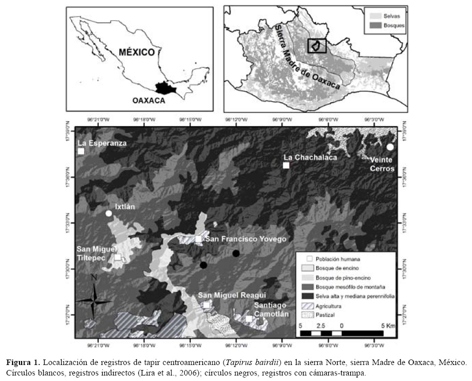 Los bosques y selvas de la sierra Madre de Oaxaca conforman un macizo de vegetación casi continuo, interrumpido en partes por los cañones de ríos y caminos que comunican a los poblados; sólo la carretera interestatal Oaxaca-Tuxtepec secciona completamente, con dirección norte a sur, el continuo de vegetación. Por ello, se esperaría la presencia del tapir centroamericano a lo largo de la sierra Madre de Oaxaca; sin embargo, Figel et al. (2009, 2011) evaluaron la presencia del jaguar y la percepción que los habitantes tienen sobre esta especie, utilizando cámaras-trampa y entrevistas, respectivamente, en la región de la Chinantla, a 70 km al noroeste de la sierra de Villa Alta, reportan como presas potenciales a los ungulados Pecari tajacu, Mazama americana y Odocoileus virginianus, sin encontrar evidencia de la presencia del tapir. Por tanto, es posible que la distribución actual del tapir centroamericano tenga su límite de distribución septentrional en los bosques de Ixtlán, continuando por las sierras de Villa Alta y Mixe, y que la superficie de hábitat propicio para esta especie en la sierra Madre de Oaxaca sea mayor al estimado por Lira et al. (2006).