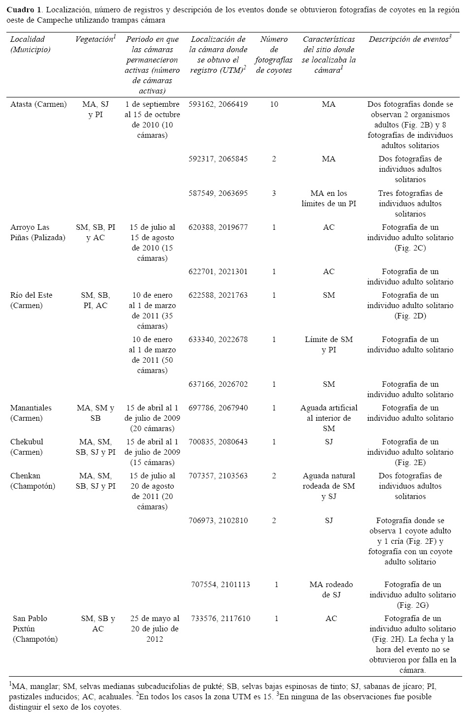 Como parte de un trabajo en el que se pretende determinar áreas importantes para la conservación del jaguar (Panthera onca) en el centro y oeste de Campeche, de 2009 a 2012, se han realizado esfuerzos de fototrampeo en 7 diferentes localidades distribuidas a lo largo de esta región (Fig. 1, Cuadro 1). Como resultado del fototrampeo, se han registrado en múltiples ocasiones la presencia de coyotes a lo largo de estas áreas. El objetivo de este trabajo es reportar los registros de coyotes observados en la región centro y oeste de Campeche como resultado del fototrampeo.