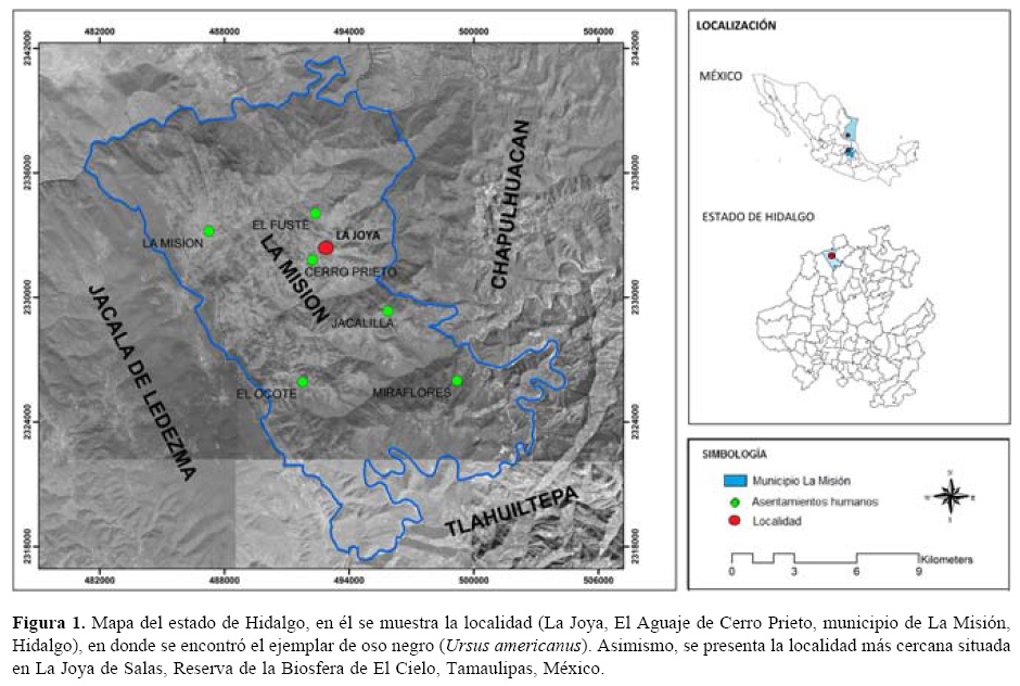 En 2005, lugareños del poblado El Aguaje de Cerro Prieto en el norte del estado de Hidalgo, reportaron ante la Profepa-Hidalgo que mataron a un oso negro como represalia por que atacó a un borrego. Lo anterior sucedió en el municipio de La Misión a 1 481 m de altitud, en un lugar conocido como La Joya (0.66 km S y 5.86 km E La Misión, Hidalgo; 21°05'30" N, 99° 04'05" O; Fig. 1). El tipo de vegetación predominante en el lugar corresponde a un bosque mesófilo alterado (Rzedowski, 2006).