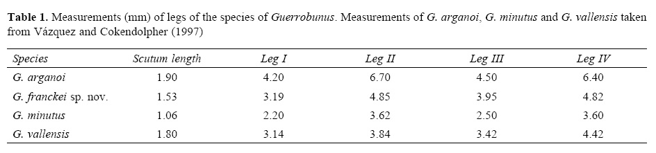 Vázquez and Cokendolpher (1997) distinguished these species based on troglomorphic characters: G. minutus Goodnight and Goodnight, 1945 (type species), with eyes darkly pigmented; G. vallensis, with unpigmented and reduced eyes; and G. arganoi, eyeless. In this contribution G. franckei sp. nov. is described and compared to these species. It is very similar to G. vallensis (both have unpigmented and reduced eyes), but differ in the male genitalia; furthermore, they come from different type localities (caves), in different cave systems (Bonet, 1971; Sprouse and Sprouse, 1985) . Troglobitic harvestmen and other troglobitic arachnids usually have restricted distributions, associated only to the type locality and very close and related caves, with a common geological history (Ubick and Briggs, 2008; Francke, 2009; Hedin and Thomas, 2010).