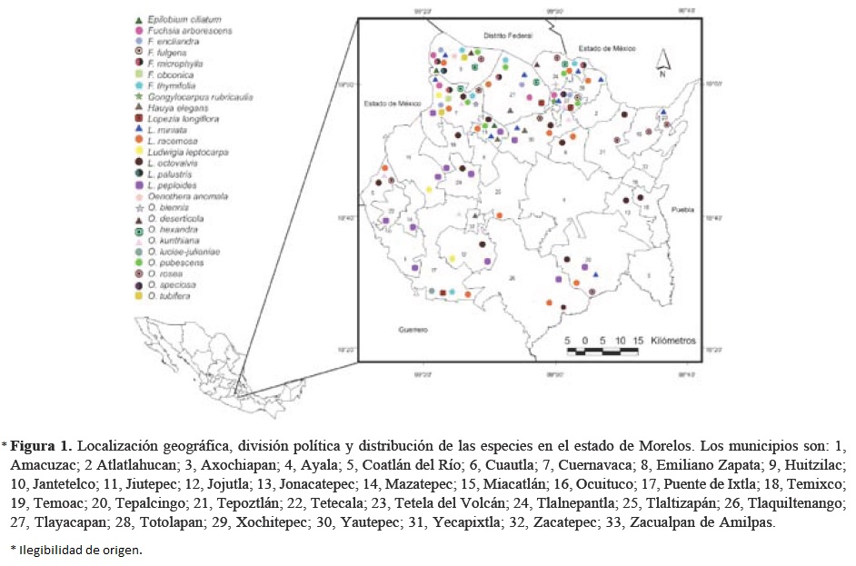 Morelos es uno de los 9 estados del país con mayor número de endemismos en su flora (Anónimo, 1998), donde se ha registrado la presencia de la familia Onagraceae a través de listados florísticos realizados en algunas regiones y municipios (Bárcenas, 1977; Bonilla-Barbosa, 1992; Cerros-Tlatilpa y Espejo-Serna, 1998; Dorado et al., 2005; Soria, 1986; Flores-Castorena y Martínez-Alvarado, 1990; Galindo y Fernández, 2002), así como en el estado en general (Rowell, 1964; Vázquez, 1974; Bonilla-Barbosa y Villaseñor, 2003). Este trabajo es una contribución al conocimiento de la flora del estado de Morelos, que incluye, con base en una revisión crítica de material de herbario y colectas propias, la lista actual de las especies de Onagraceae que crecen en la entidad, así como datos sobre su distribución.