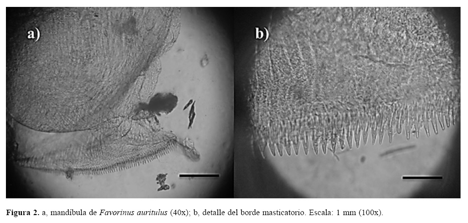 La mandíbula se asemeja a la descrita por Marcus (1955) y Edmunds y Marcus (1977). Presenta un borde masticatorio (Figs. 2a, b) con 86 dientecillos. Desde el borde superior los dientes son muy pequeños y van aumentando de tamaño. La rádula (Fig. 3) es uniseriada con 22 dientes, 2 de los cuales se observan menos claros que los demás, sin dentículos laterales, coincidiendo con lo reportado por Edmunds (1964). El sistema reproductivo se asemeja al descrito por Edmunds (1964), observándose un pene de 0.15 mm de longitud y 0.05 mm de ancho en el animal de 9.2 mm de longitud total y de 0.2 mm de longitud y 0.09 mm de ancho en el de 8.6 mm. Se visualiza claramente la forma del ganglio cerebral y región pericárdica en el animal vivo. La puesta es un cordón blanco enrollado y se estima un tiempo aproximado de ovoposición de 26 minutos, calculado desde el momento en que 1 de los ejemplares realizó la misma en el recipiente donde se mantuvieron posteriores a la captura.