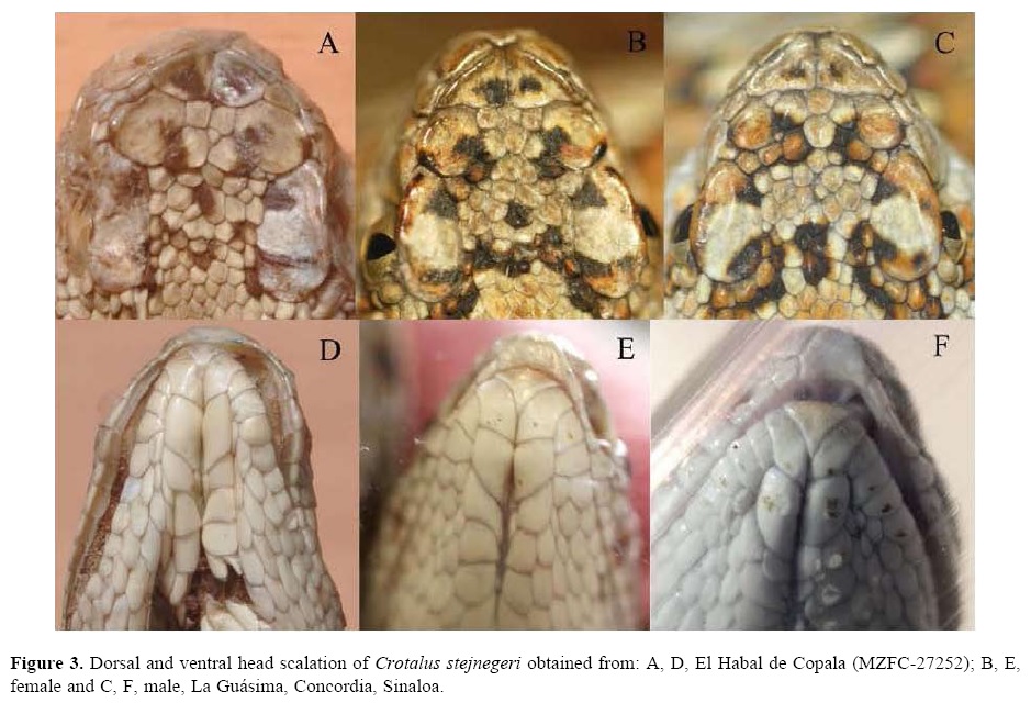The first author is very grateful to the forest keepers Mario González Sánchez, Gustavo García Medina, José Ocejeda Martínez, Guadalupe Lizárraga Guerrero, and Alfredo Pasos Cabrera who made the many field trips to the Cerro del Pirame possible and especially Alfredo, who spotted the first live C. stejnegeri. The assistance of Marcela Ruiz Guerrero and Alwin van der Heiden during these excursions is greatly appreciated. Robert Villa and Will Lattea expertly manipulated the live rattlesnakes to obtain measurements and counts. Figures 2C and 3E, F were taken by Will Lattea. Valerie Williams Holland kindly revised the manuscript for the correct use of the English language. The manuscript was reviewed by R. W. Bryson Jr. and one anonymous reviewer to whom we are very grateful. Funding for the study of the biodiversity of the Cerro del Pirame area was provided by Conanp and CIAD. Fieldwork was conducted under the collecting permit issued to Oscar Flores-Villela by Semarnat.