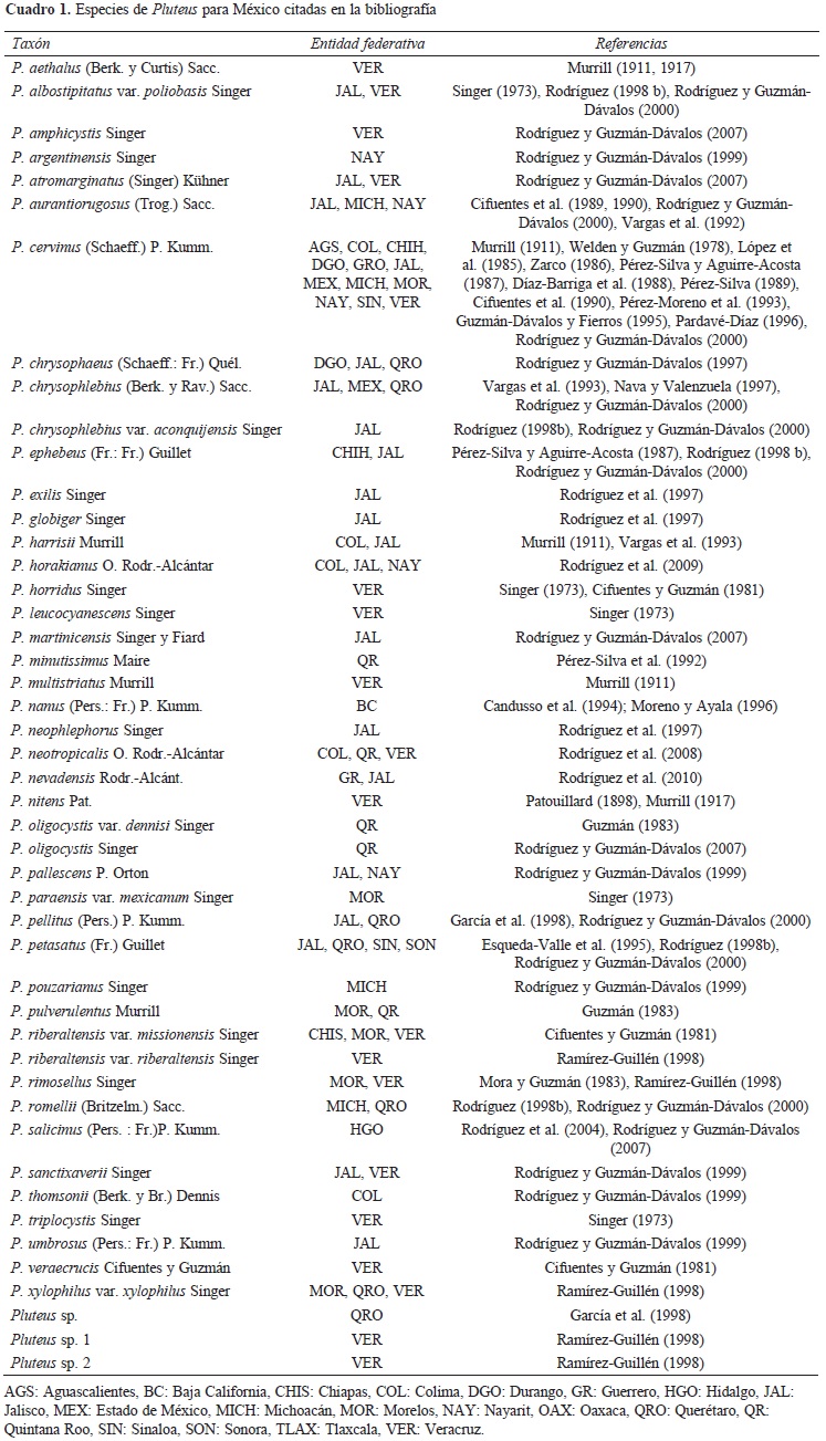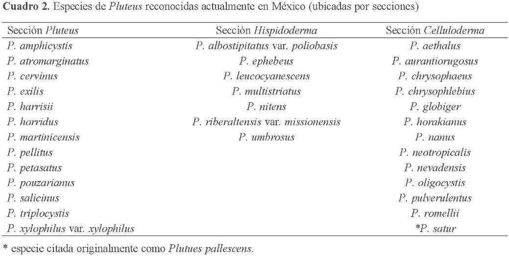 De acuerdo con lo citado en la bibliografía, son 47 los taxones de Pluteus registrados para México (Cuadro 1). Sin embargo, la reexaminación de estos ejemplares, resultó en el reconocimiento de sólo 33, que corresponden a 30 especies y 3 variedades (Cuadro 2). Dichos taxones están distribuidos en las 3 secciones de Pluteus de la siguiente manera: Pluteus (13), Hispidoderma (7) y Celluloderma (13).