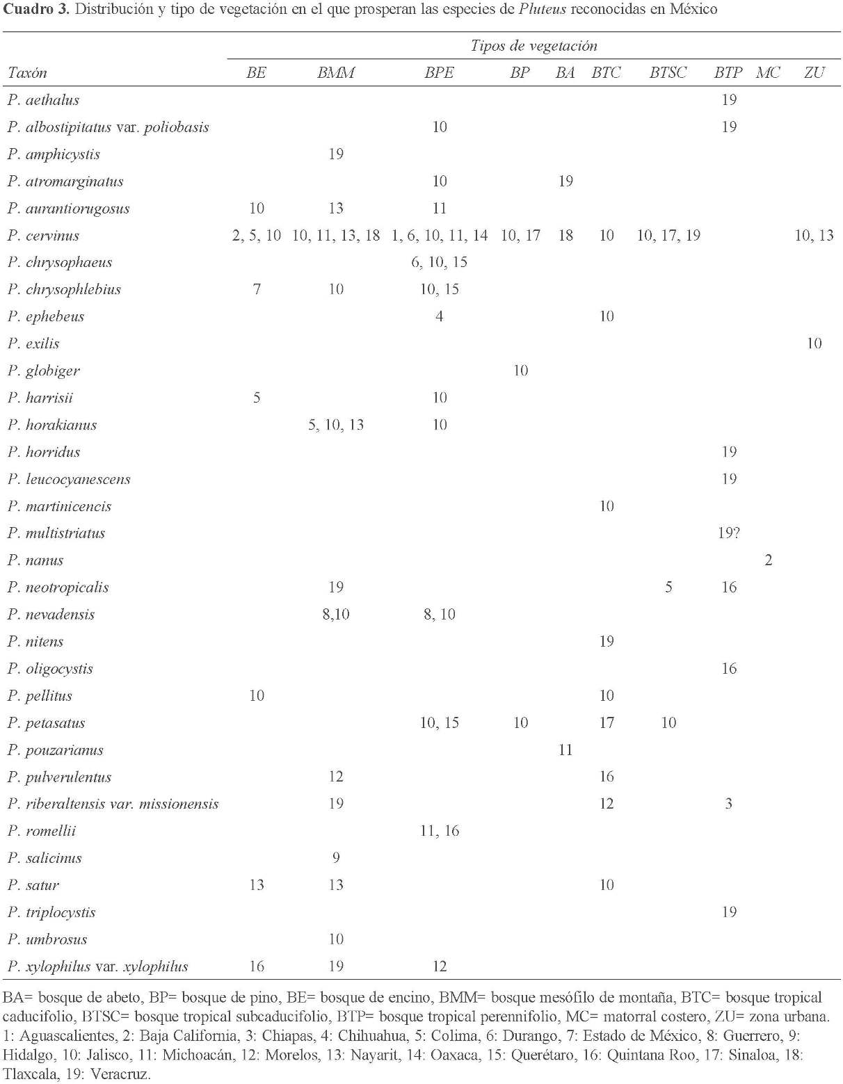 De los 32 estados que conforman México, en 19 de ellos se tienen citas de Pluteus. Las regiones donde no se tienen citas son la región noreste, la parte sur de la península de Baja California y el estado de Yucatán principalmente. Jalisco y Veracruz, hasta el momento, son los que presentan el mayor número de citas de Pluteus, con 18 y 13, respectivamente, seguidos de Nayarit y Quintana Roo, con 4 registros (Cuadro 3). El conocimiento sobre la distribución del género en el país realmente es escaso, debido a la falta de estudios o inventarios en muchas regiones o entidades poco recolectadas.