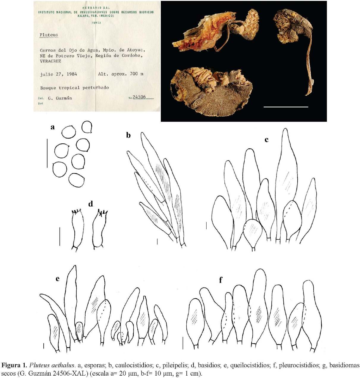 Sin embargo, con base en las observaciones de los especímenes de Ecuador y México, y del material tipo de Pluteus aethalus, se encontró lo siguiente. La descripción microscópica del espécimen mexicano (Singer M 8186), resultó ser afín a lo observado en el holotipo e isotipo de P. aethalus (K, FH), aunque el largo de las esporas fue ligeramente mayor en el ejemplar Singer M 8186 y los queilocistidios menores en longitud, pero el tamaño de los elementos de la pileipelis (85-117.5 × 10-22.5 mm) y el de los caulocistidios (62.5-87.5 × 7.5-10 mm), así como el resto de los caracteres microscópicos, concuerdan con lo citado por Dennis (1953), Pegler (1983) y Courtecuisse (1991) para P. aethalus.