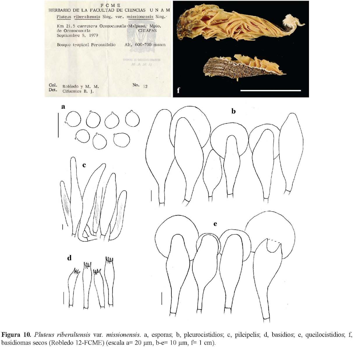 Comentarios taxonómicos. Este taxón difiere de la variedad típica por la incrustación resinosa conspicua de los pleuro y queilocistidios, y el tamaño ± similar de los mismos. Se diferencia también de P. riberaltensis var. conquistensis Singer por el estípite longitudinalmente fibriloso, con fibrillas de tonalidades gris-umbrino (Singer, 1961). El estudio del material tipo de P. riberaltesis var. missionensis no fue posible realizarlo, sólo el de P. riberaltensis var. riberaltensis que fue examinado para confrontar la identificación del taxón.